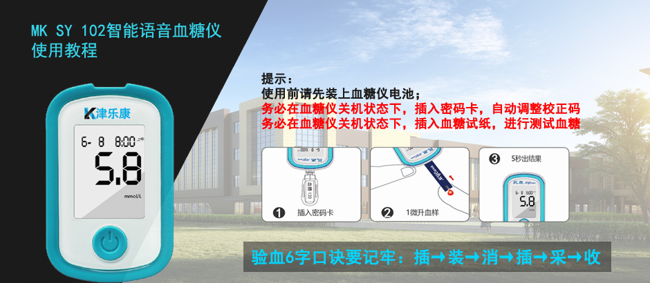 民康MK SY102智能語音血糖儀使用教程,提示: 使用前請先裝上血糖儀電池; 務(wù)必在血糖儀關(guān)機(jī)狀態(tài)下,插入密碼卡,自動調(diào)整校正碼 務(wù)必在血糖儀關(guān)機(jī)狀態(tài)下,插入血糖試紙,進(jìn)行測試血糖